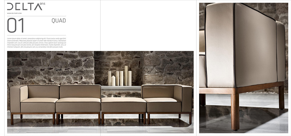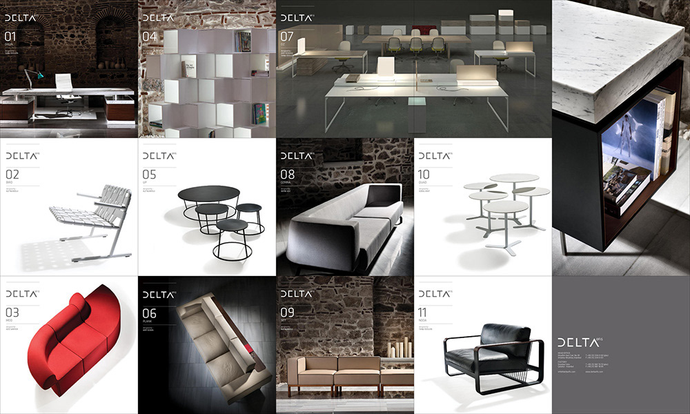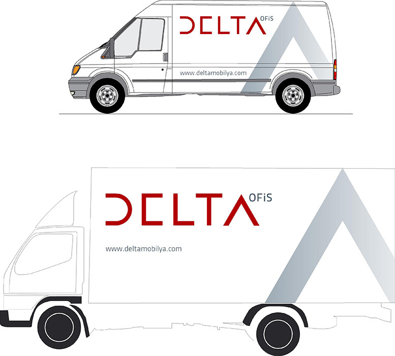 Mobilya tasarım ofisi Delta için kurumsal kimlik çalışması, katalog, ilan tasarımları ve araç giydirme